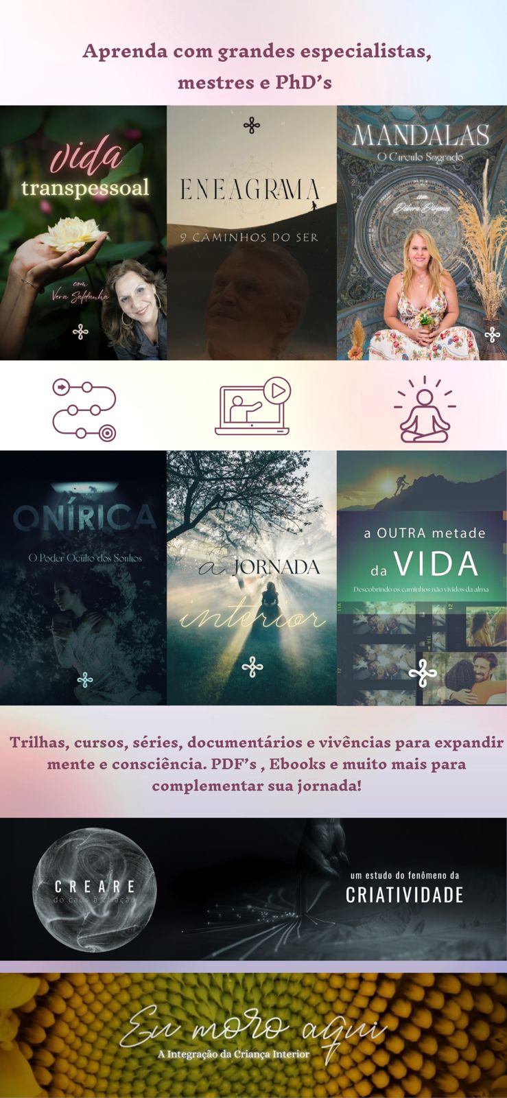Oferecemos aulas gravadas, ao vivo, séries, documentários, trilhas de conteúdo, ebooks e PDFs. Toda semana algum tipo de conteúdo novo para sua jornada não ficar parada.